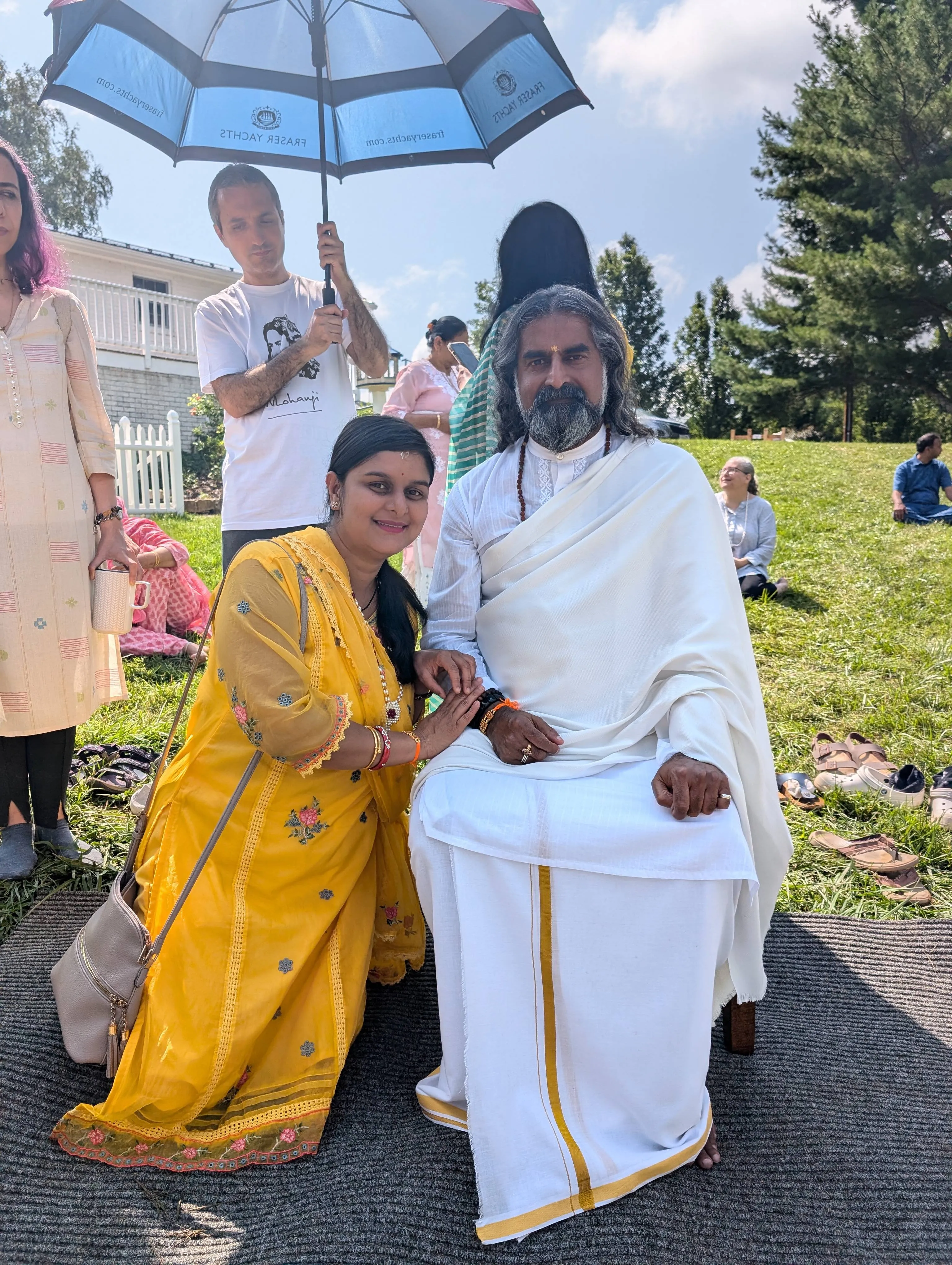 In my sleep, I had a dream. In my dream, I saw that I was traveling on a bus. I also saw Mohanji traveling on the same bus, but he was three or four rows ahead of me. Then I saw a room with a stage, and there was an empty white sofa on that stage. That sofa was exactly the same as the one where Mohanji sits whenever he visits MCB USA. Then I saw Mohanji sitting on the sofa, wearing a white robe. I went near him and bowed down. My head touched his knees.
