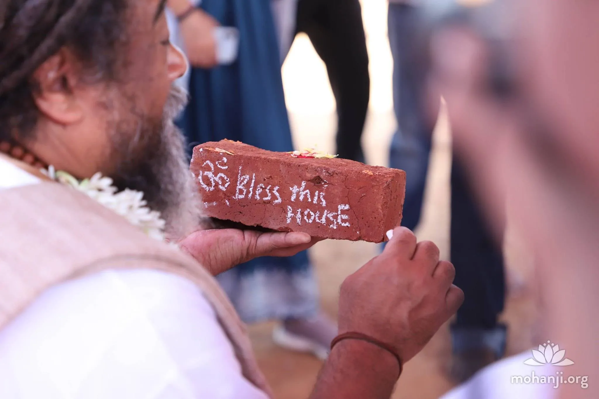 On the day of the function, everything went like clockwork. The pujas were conducted flawlessly, a large group of supporters came together to celebrate the occasion, and soon the chief guests unveiled the foundation stone to launch the project. Mohanji arrived with Mooji Baba, and both Masters addressed the audience to explain the value of serving selflessly and spreading kindness. At Mohanji’s request, Mooji Baba planted two audumbar saplings at the site and gave his blessings for the project’s success. Each audience member also put their intentions onto a brick and handed it over to the priests for consecration. Subsequently, bricks blessed by Ma Devaki at Yogi Ramsuratkumar ashram and Devi Amma, a great Siddha saint from Bangalore, were also added to this set. These blessed bricks currently adorn a wall of the reception area of the Mohanji Home for Seniors.