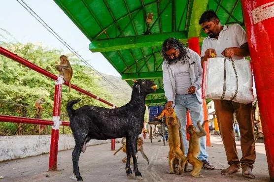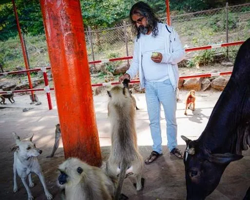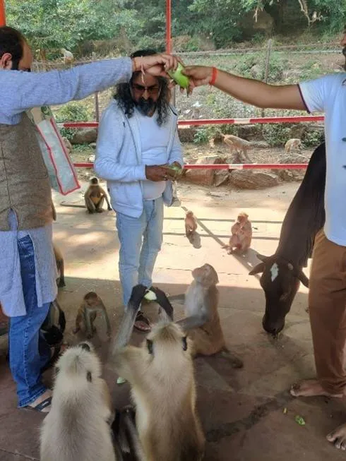 Normally, monkeys can be quite troublesome and scare people. However, they were in extraordinarily good behaviour in Mohanji’s presence, taking food from our hands like little children unthreateningly. Mohanji constantly fed beings at almost every step. He mentioned that animals respond to us as we do to them. If we approach with fear, they respond with fear and aggressive behaviour. As we operated with love and kindness and fed them generously without fear, they mirrored in kind and behaved like ‘good children’. Mohanji would throw bananas or brinjals to one side of the path or onto the boundary walls to make it easier for monkeys to pick up and eat. Some monkeys connected with Mohanji and had an eye-to-eye conversation before scurrying off. Throughout the parikrama, we observed various such exchanges where animals connected deeply with Mohanji, and we had the blessed opportunity to serve thousands of them.