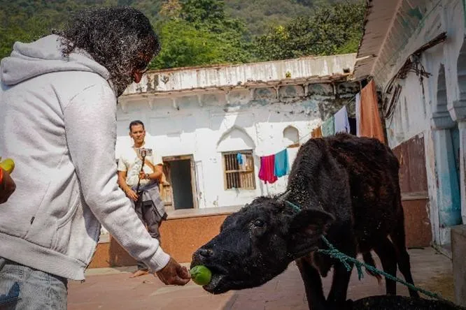 A few episodes were particularly interesting. One monkey swooped down the parapet wall from a high roof, watched Mohanji intently, approached him and collected his banana in one smooth move without letting the banana fall to the ground. Mohanji casually commented, “No more monkey lives for him. He will take a human birth in his next life!” Later in the parikrama, Mohanji took a small detour to feed a calf, staying with him for several minutes longer than with any other animals until then.