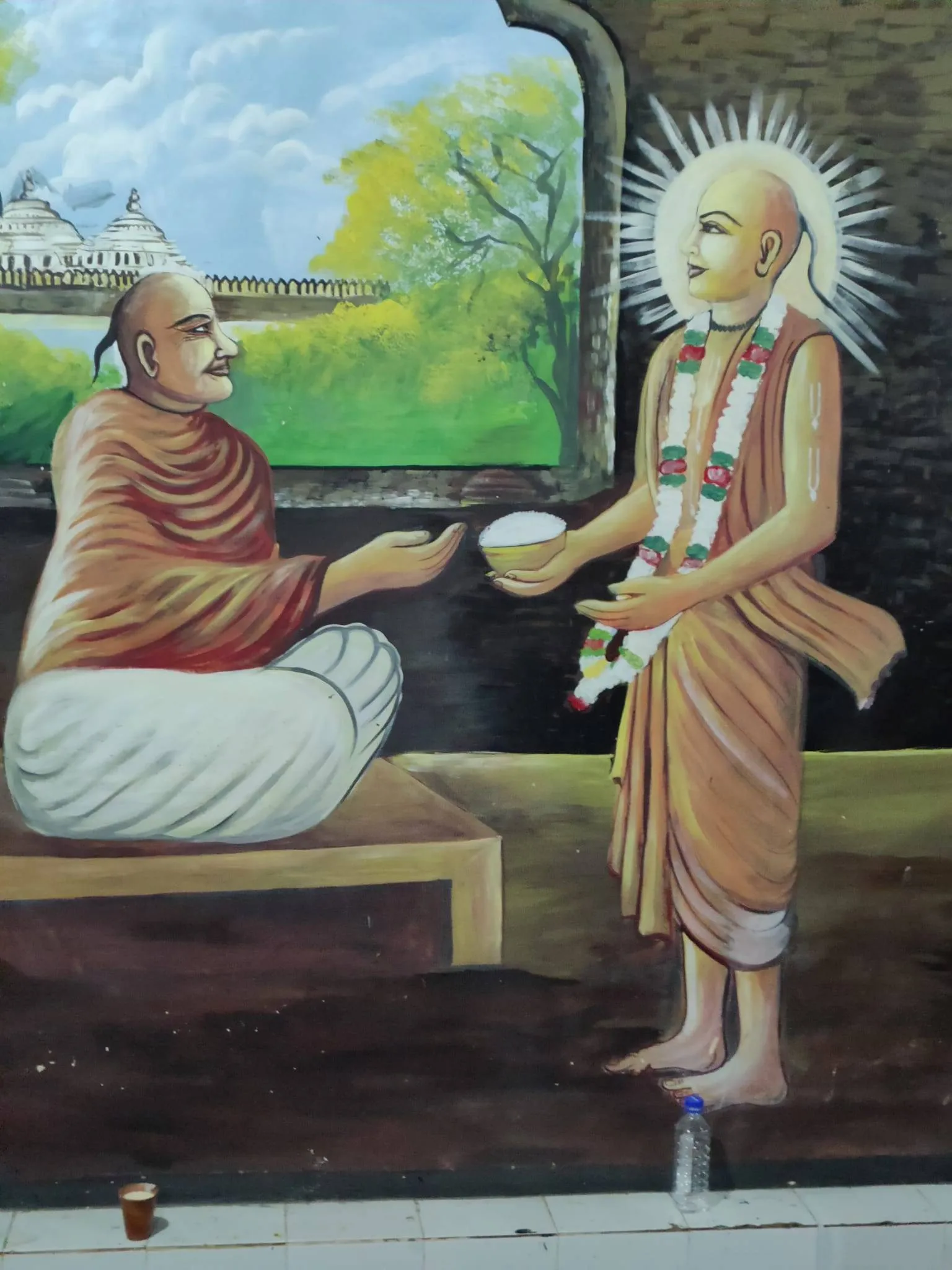 Sathya: Upon entering the shrine, Appa felt attracted to the painting of Chaitanya Mahaprabhu on the wall and anointed it with Sandal paste. What struck me about this Dham was that nearly every priest said, “Krishna bakthi!” when we sought their blessings. May you attain the love for Krishna. We rendered a few bhajans there; we witnessed a powerful arathi at noon. With the drumbeats accompanying the arathi, it felt as though the dance of Krishna and Radha was coming alive. After the arathi, we went to the backyard from where a body of water was visible at a distance. A priest accompanying us mentioned that it was Radha Kund. Mohanji was also with us. He joked, “Radha is idhar, Kund is udhar”, looking at you.