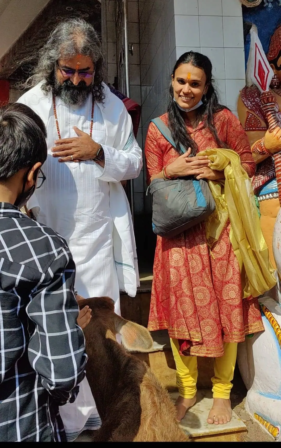 Sathya: A cow constantly moved about in the outer area and stood between Mohanji and Devi like a child. The story of the temple itself is connected to Kamadhenu, the celestial cow- which spontaneously bathed the Shiva Linga with her milk.
