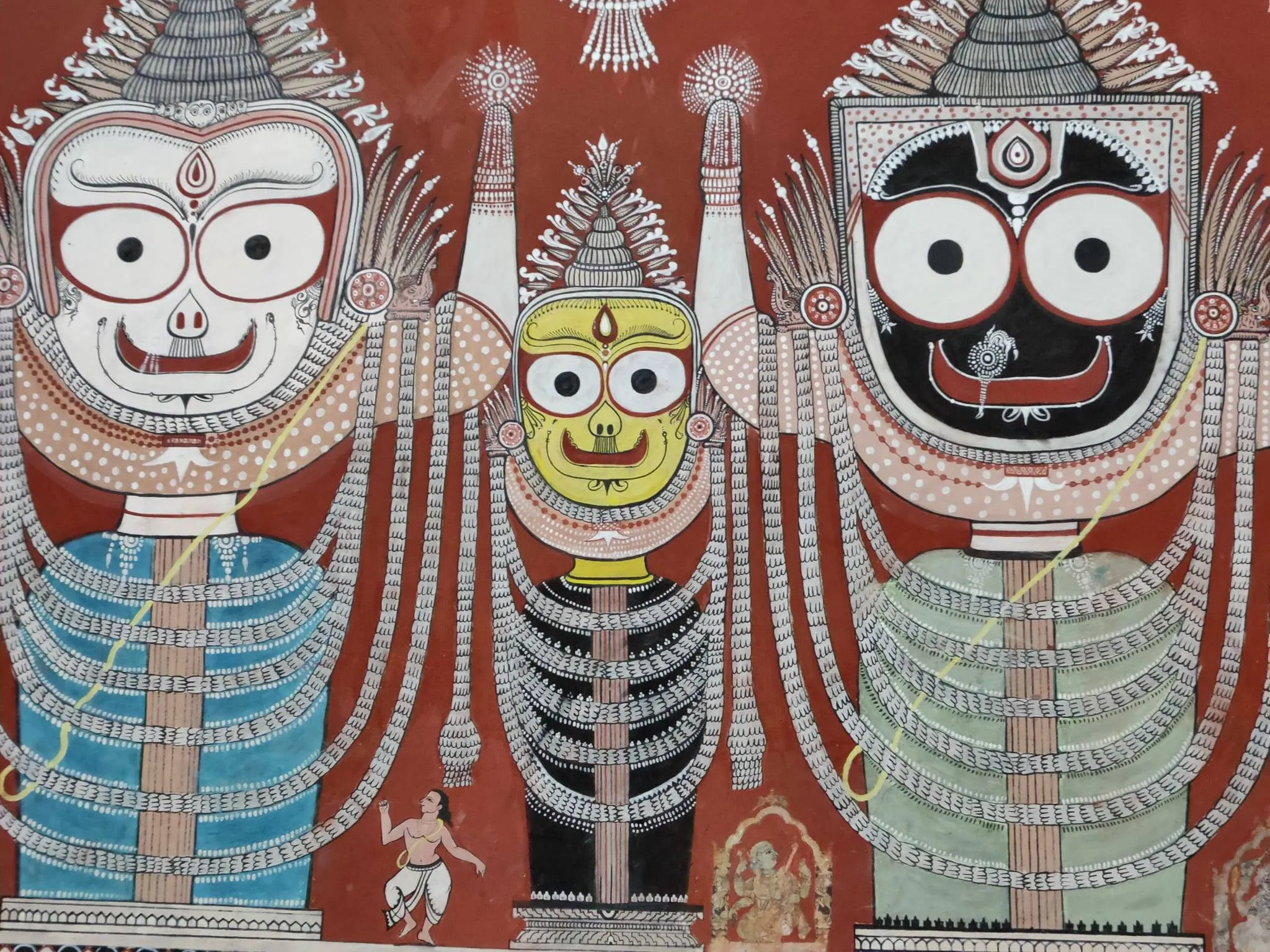 As we neared the sanctum, our eyes were glued to the deities trying to absorb all that we could in one go as the Panda/Priest described, “The dark one to the Right is Krishna, Devi Subadra in the middle, and the light-complexioned one is Balabadra”.