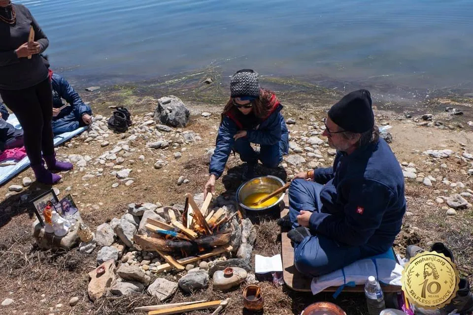 Thereafter, when everyone was dressed warmly again, the ‘Homa’ (ceremony of fire) was performed, led by Kannaiah at the request and instruction of Mohanji on the bank of the celestial lake. Up in the sky, the sun was surrounded by a corona – an experience that lingers in our memories.