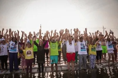 The next day Mohanji led a dip to the divine Mother Ganga. I brought with me a large robe with a hood and fleece lining, which is perfect for pre and post dip wearing and keeping warm when out of the water. Normal people used a towel. So, there I was, waiting at the entrance of the Village, wearing my robe. Mohanji arrived, and after lovingly greeting those gathered on an individual basis, he looked at me and said, ‘What are you wearing?’ There was a hint of amusement (the smile on his face gave that away) as well as incredulity. ‘It keeps me warm’, I said – ‘it’s chilly out there’ (my hardy ancestors, whom I was apparently representing and watching the show, were probably grimacing at this point). He pulled the zip of the robe slightly down to reveal his face on a T-shirt that I was wearing underneath. This met with approval. ‘Nice shoes’, Mohanji said later, referring to my all-purpose beach/water aqua shoes. I mentally noted shoes good, robe not so good. I didn’t wear the robe again on a Mohanji dip.
