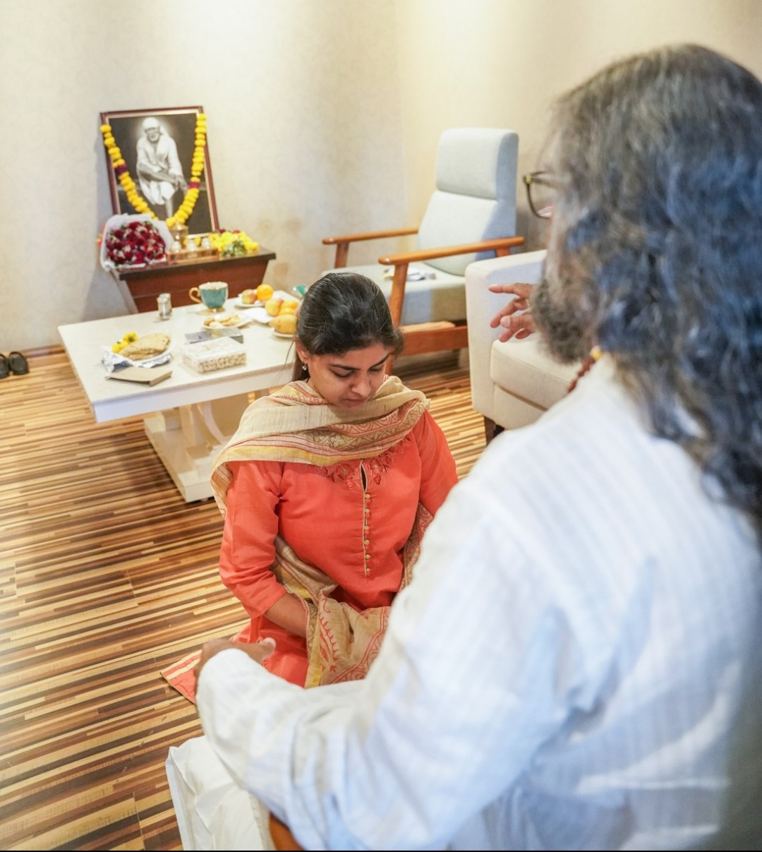 I was surprised at the smoothness, such as their consent, willingness to accompany, etc. One day, my mother and I went shopping to buy Guru dakshina for Mohanji, and we boarded the auto. After a couple of minutes, my attention casually went to the right side, and I was surprised to see a photo of Sai Baba in a blessing posture. A beautiful confirmation of his grace and presence. The wait was beautiful till the Shirdi travel. My mind was filled with happiness after a long wait of 5 and 1/2 years. All this while, I used to keep myself updated on information related to Mohanji through WhatsApp groups, Facebook, etc.