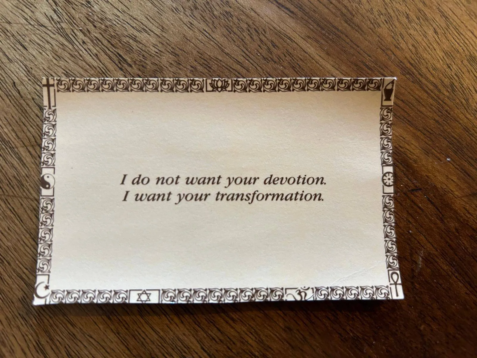 Later, while cleaning the cabinet of murtis, I found a card that read: “I do not want your devotion; I want your transformation.”